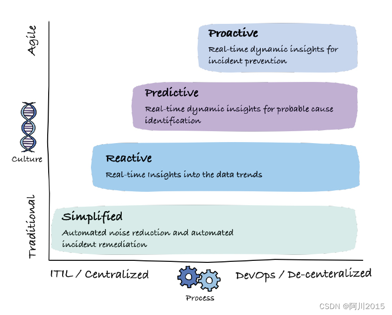 潘军表示,AIOps即智能化运维,这是一个旅程,横向是从流程化、集中式的ITIL向分布式DevOps的转变,纵向是从传统运维文化角度进行敏捷转型。该转型分为四个阶段:首先是标准化,标准化是实现运维自动化的前提;其次是响应,强调实时运维数据分析与洞察;第三是预测,即在实时数据分析的基础上,实现动态洞察和更新分析;第四是主动预防,即进一步实现事故预测与告警,进行主动式预防。
