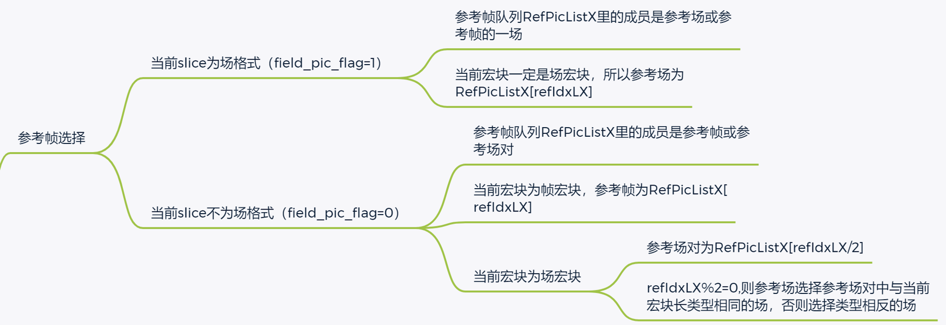 - 当前slice为场格式(field_pic_flag=1),则参考帧队列RefPicListX里的成员是参考场或参考帧中的一场。由于当前宏块一定是场宏块,所以参考场为RefPicListX[refIdxLX];
