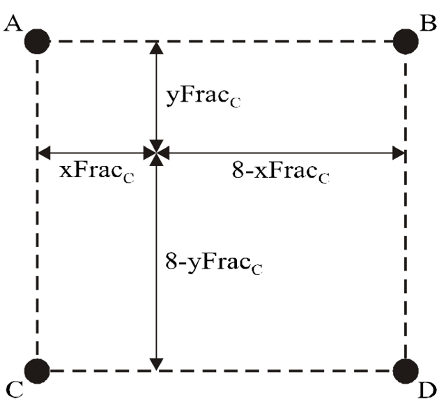 predPartLXC[ xC, yC ] = ( ( 8 − xFracC ) * ( 8 − yFracC ) * A + xFracC * ( 8 − yFracC ) * B + ( 8 − xFracC ) * yFracC * C + xFracC * yFracC * D + 32 ) >> 6