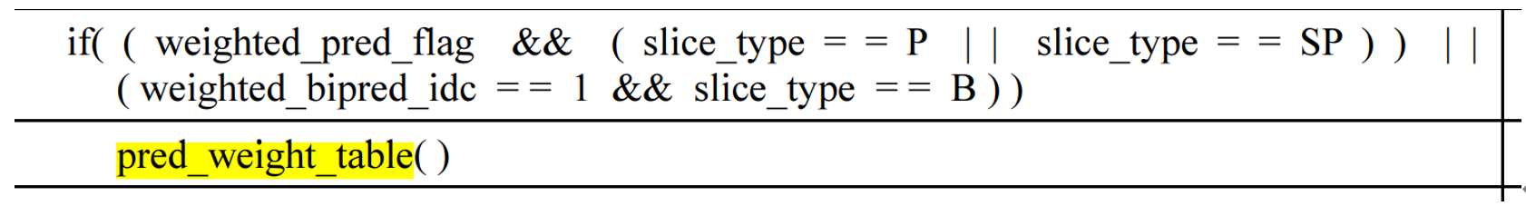 P slice的weighted_pred_flag=1或B slice的weighted_bipred_flag=1使用显式加权预测。此时slice header中编码了预测权重参数。