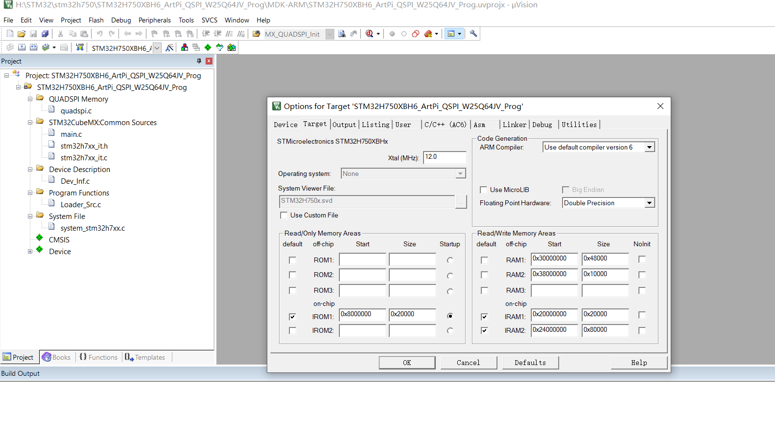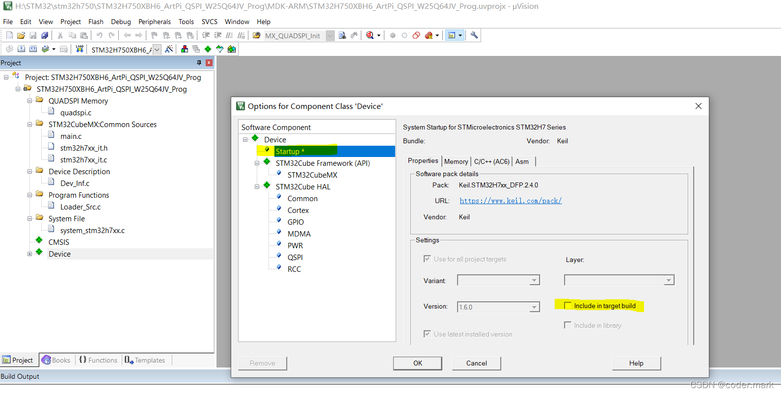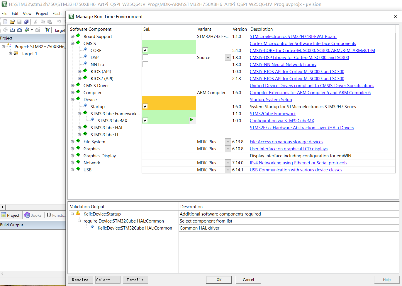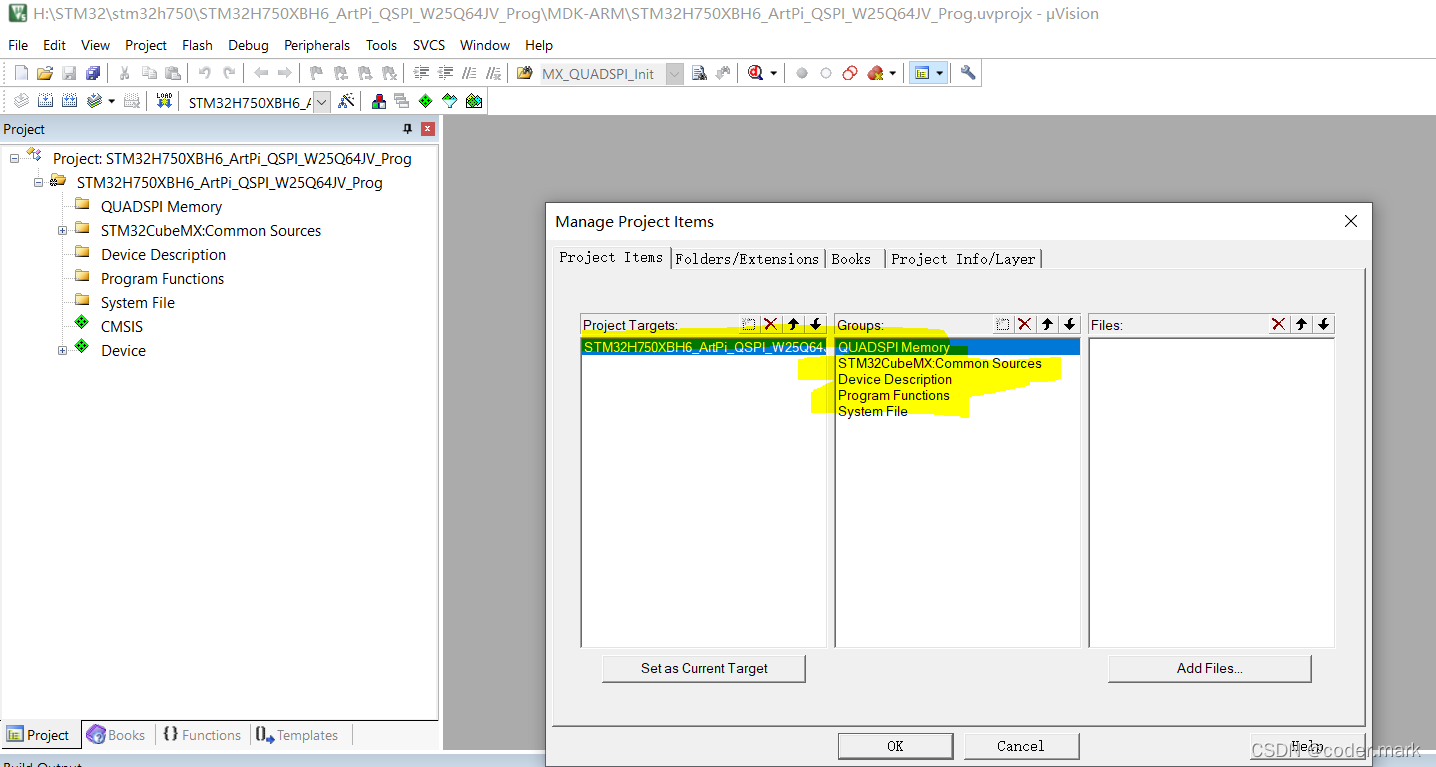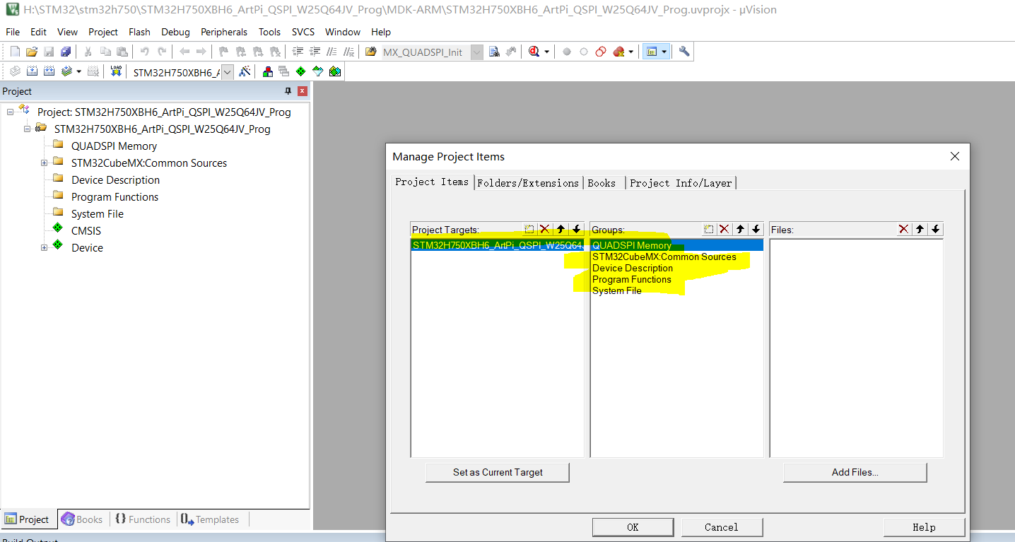 其中注意一下,System File分组的文件在工程文件夹STM32H750XBH6_ArtPi_QSPI_W25Q64JV_Prog\MDK-ARM\RTE\Device\STM32H750XBHx目录下