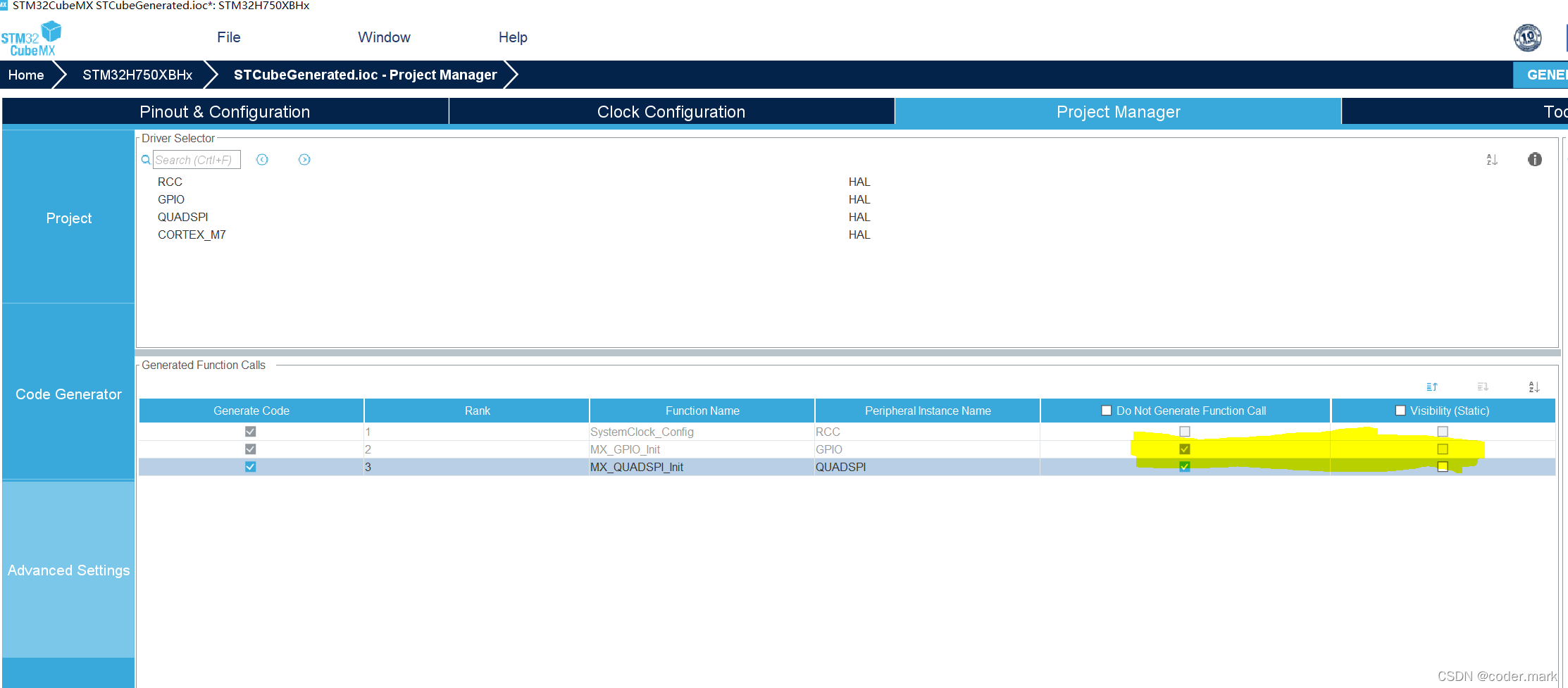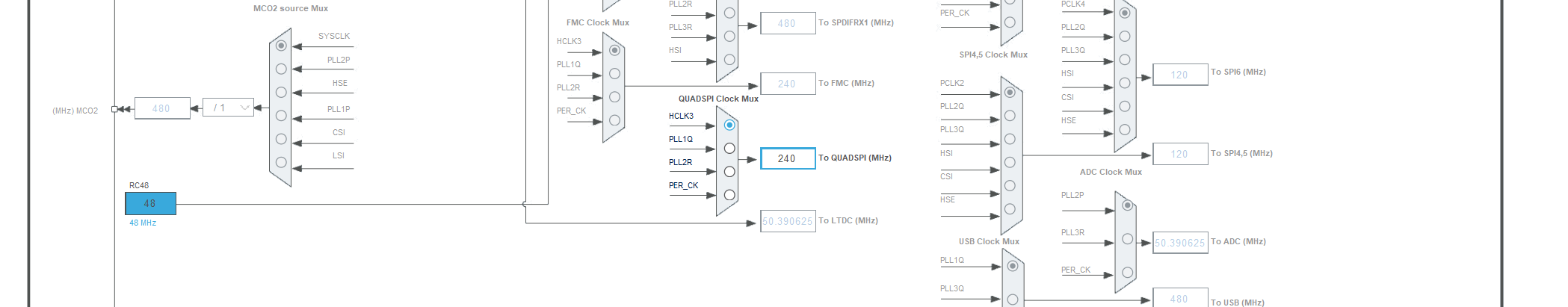 接下来我们设置系统时钟,开发板外部主时钟为25MHz,我们设置主频为480MHz, HCLK3为240MHz,二分频后QUADSPI时钟为120MHz,不超过W25Q64JV Flash最大的时钟频率133MHz。