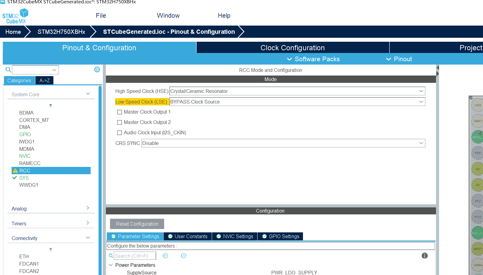 LSE指外部低速时钟,黄色说明可能存在冲突,我们这边选择旁路时钟源。
