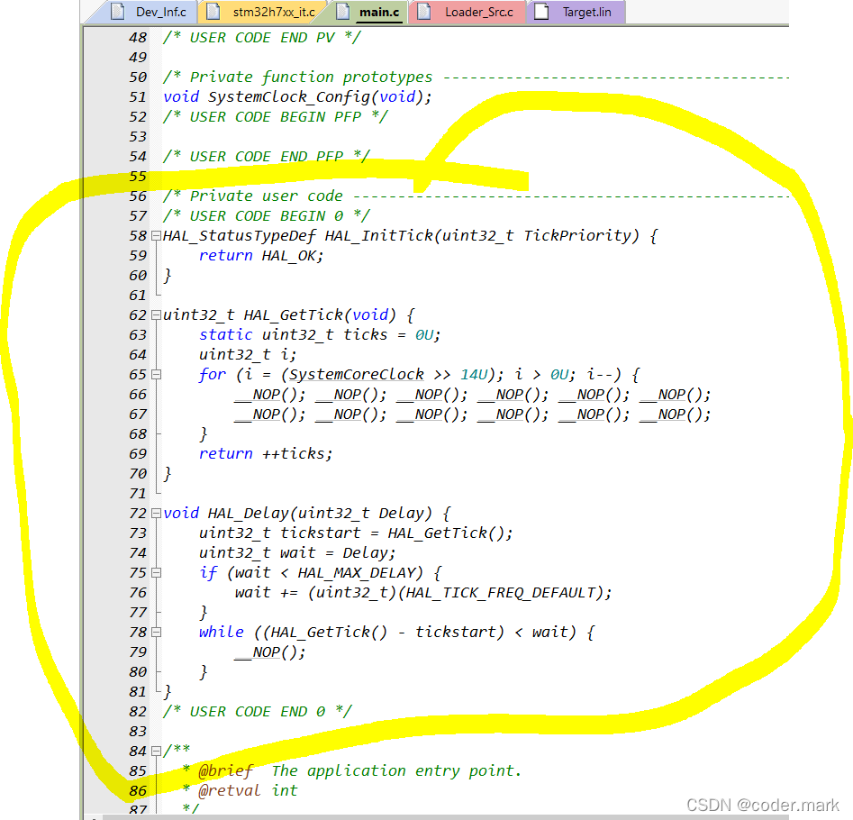 注意我们需要在生成的代码main.c中添加部分代码,完整的main.c代码如下