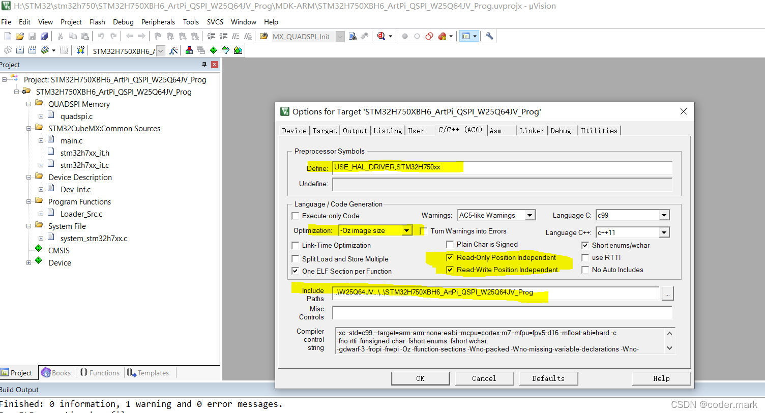 上图中需要添加宏USE_HAL_DRIVER,STM32H750xx以及添加头文件路径,即工程根目录以及跟目录下的W25Q64JV