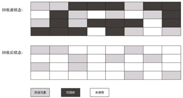 - 缺点;会产生大量的内存碎片,造成内存环境质量下降,影响程序运行性能(在分配较大对象时,如果没有足够的连续内存地址空间,就会不得不触发额外的GC,)
