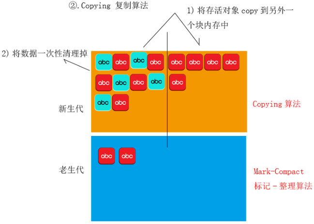 - 将存活对象copy到另外一个块内存中,再将数据一次性清理掉