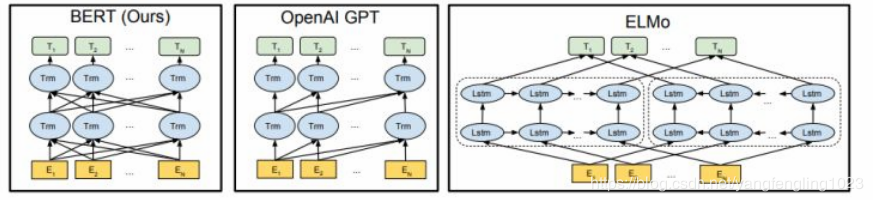 下图展示了三种预训练模型,其中 BERT 和 ELMo 都使用双向信息,OpenAI GPT 使用单向信息