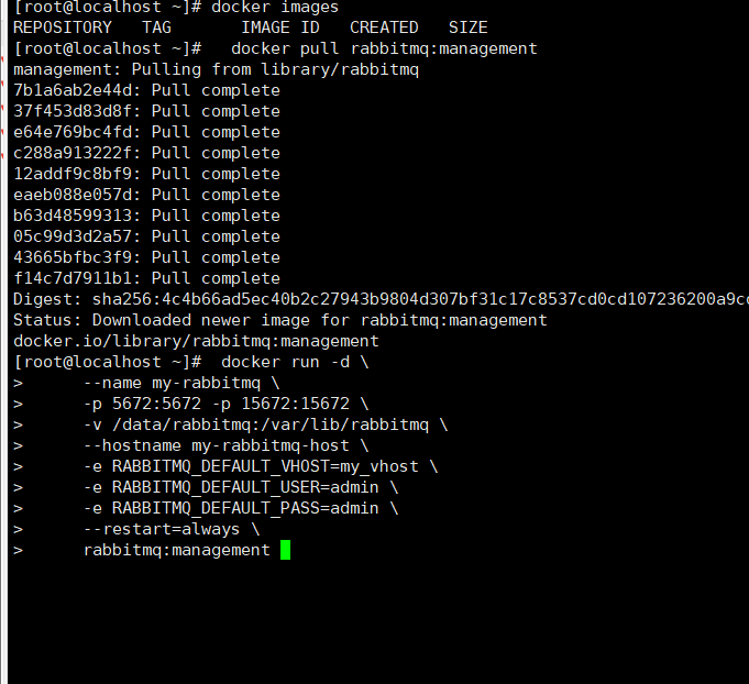 docker run -d -p 5672:5672 -p 15672:15672 --name rabbitmq rabbitmq:management