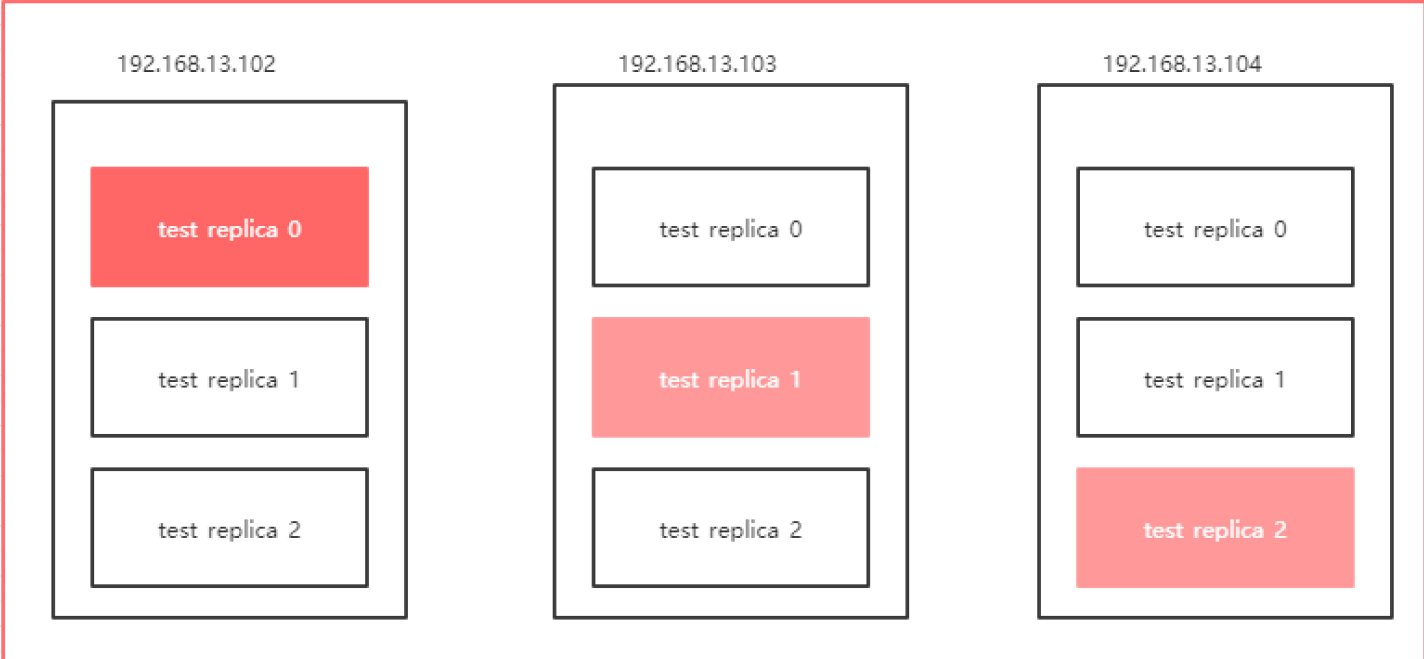 下图中,深红色部分表示test_replica分区的leader副本,另外两个节点上浅色部分表示follower副本