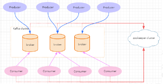 多个broker协同工作,producer和consumer部署在各个业务逻辑中。三者通过zookeeper管理协调请求和转发。这样就组成了一个高性能的分布式消息发布和订阅系统。