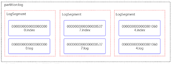 segment file由2大部分组成,分别为index file和data file,此2个文件一一对应,成对出现,后缀“.index"和”.log"分别表示为segment索引文件、数据文件。
