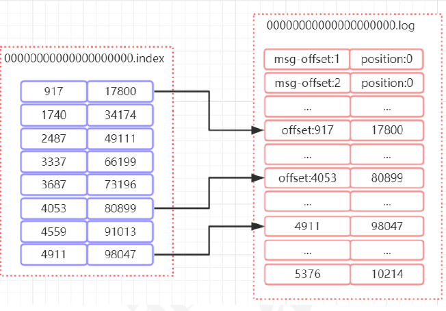 如图所示,index中存储了索引以及物理偏移量。 log存储了消息的内容。索引文件的元数据执行对应数据文件中message的物理偏移地址。举个简单的案例来说,以[4053,80899]为例,在log文件中,对应的是第4053条记录,物理偏移量(position)为80899. position是ByteBuffer的指针位置