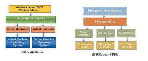 Hyper-V与其他的虚拟化平台相比,突出的特点就是精简了结构提高了性能,下面我们用Virtual Server作为传统虚拟化技术的代表与Hyper-V进行对比。Hyper-V和Virtual Server虽然同为微软的服务器虚拟化产品,却有着很显著的区别:Hyper-V在构架上已经完全不同于后者,可以说是微软在虚拟化技术上的一个突破性进展。从图中我们很容易看到他们的区别。