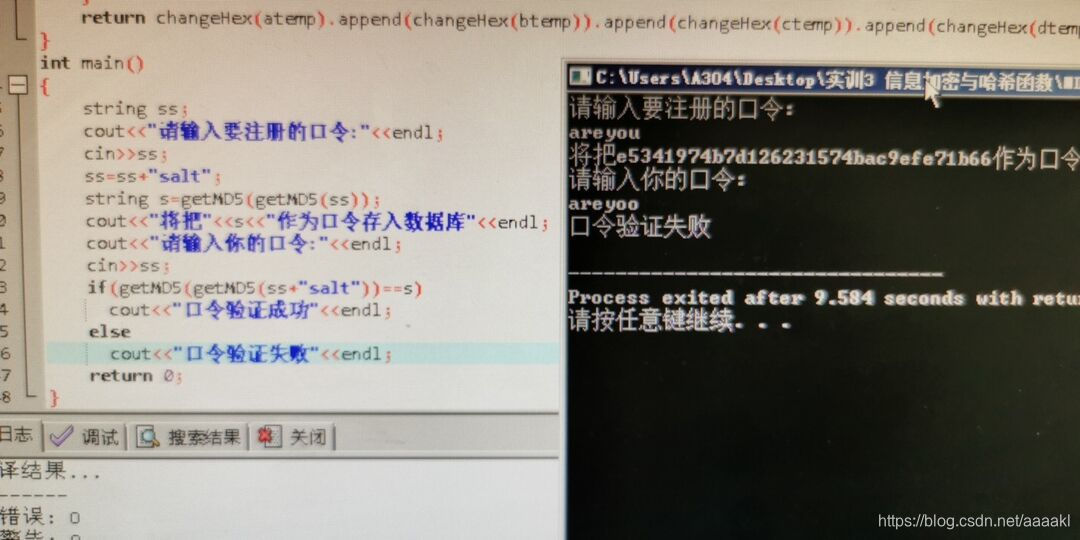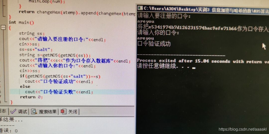 - 在MD5.cpp中编写程序,模拟系统口令设置与验证程序,要求对口令进行MD5加密后保存,再次登陆时进行验证。