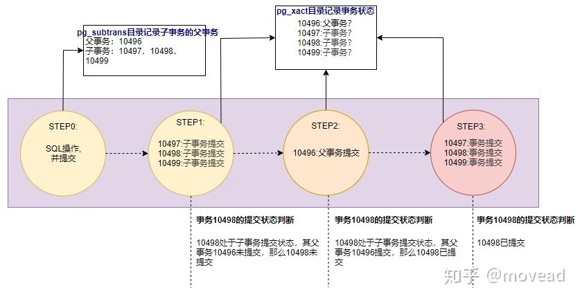 有所不同的是提交过程。所有父事务和子事务,最终都要标记为commit或者abort状态(中间rollback的事务,可以不看为是子事务)。为了保证整个父事务和子事务原子性,PostgreSQL为子事务的提交设计了一套提交机制: