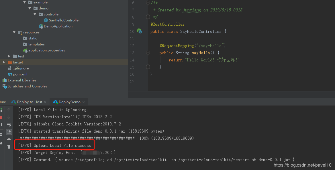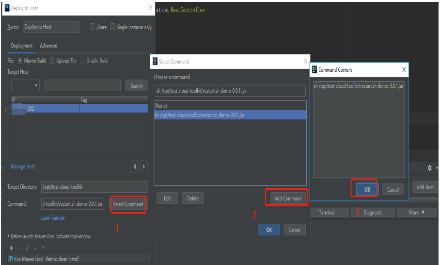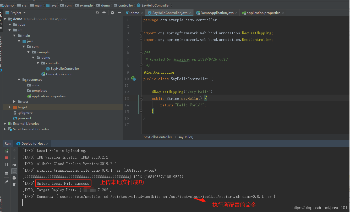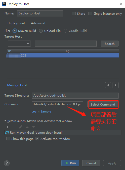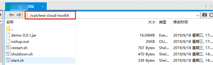 sh /opt/test-cloud-toolkit/restart.sh demo-0.0.1.jar解释为: 项目部署后执行restart.sh脚本,这个脚本的作用是重启服务。后面的demo-0.0.1.jar是一个参数传入脚本文件中。