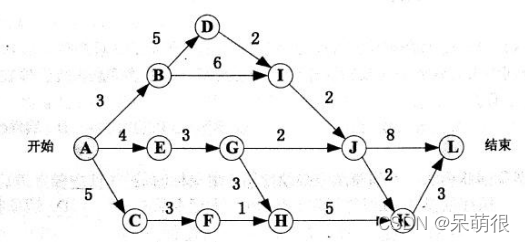 根据上图计算出关键路径为A-B-C-E-F-I-K-L,其长度为24,关键路径上的活动均为关键活动。活动BD不在关键路径上,包含该活动的最长路径为A-B-D-G-I-K-L,其长度为22,因此松弛时间为2。