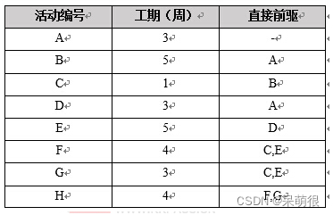 【解析】本题考查软件项目管理的基础知识。活动图是描述一个项目中各个工作任务相互依赖关系的一种模型,项目的很多重要特性可以通过分析活动图得到,如估算项目完成时间,计算关键路径和关键活动等。根据上表给出的数据,构建活动图,如下图所示。