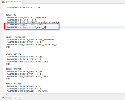 2,平时 ZYNQ在启动时打印用的是串口1,所以在 system.mss 中修为串口为ps7_uart_1。点击 system.mss 下的 Source,按下图修改完成。修改之后点击 Re-generate BSP Source 按钮,重新产生 fsbl 文件。编辑完成之后会在保存工程目录下的 vx.sdk 下出现 vx目录,vx 目录下会产生 Debug 目录,里面会有 xxx.elf 即是 fsbl。