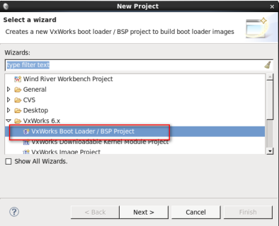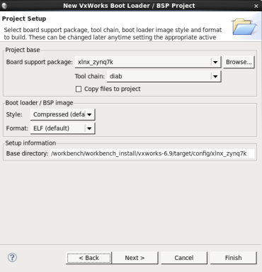 (2)选择类型为 vxWorks Boot Loader/BSP Project,点击 Next 输出 Project name,点击 Next,如图界面,最后点击 Finish。