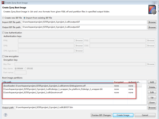 4,生成Boot.bin 文件:vxWorks 的启动文件 Boot.bin 由 3 部分组成:fsbl、.bit、bootrom,其中.bit 由FPGA 提供,而且在生成 Boot.bin 时,这 3 者的顺序必须是 fsbl、.bit、bootrom,最后create image,就生成BOOT.BIN文件了