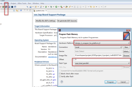 5,BOOT.BIN烧写:生成好 Boot.bin 之后利用 JTAG 烧写到 Zynq 板,烧写点击 Program Flash 如图所示,注意 Hardware Platform、offset、Flash Type 选项。烧写完成之后,重新启动 Zynq 板,串口出现打印且能正常工作,说明烧写成功。