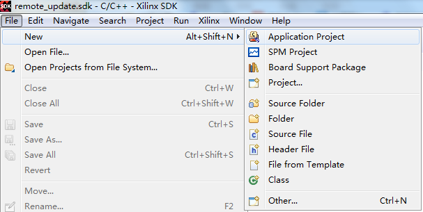 (1)生成.bit文件,Export Hardware 之后,点击 File 里面的 Launch SDK,启动 SDK。打开 SDK 之后点击 File->New->Application Project。