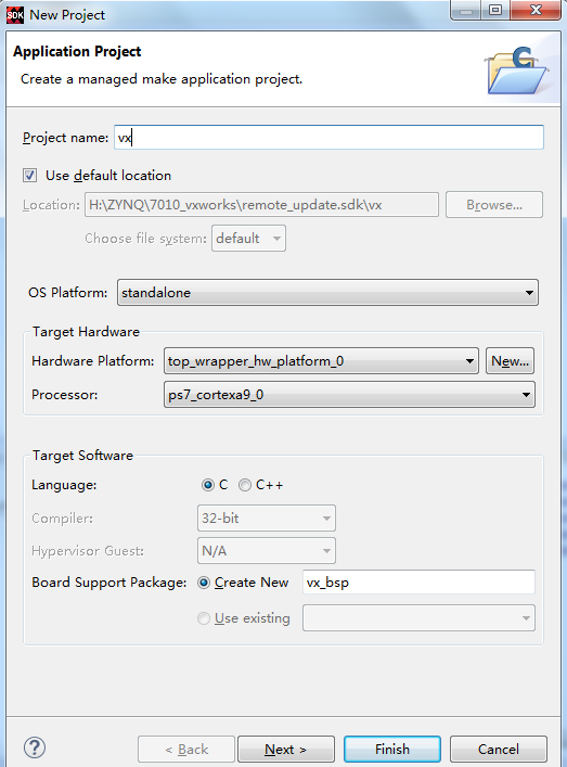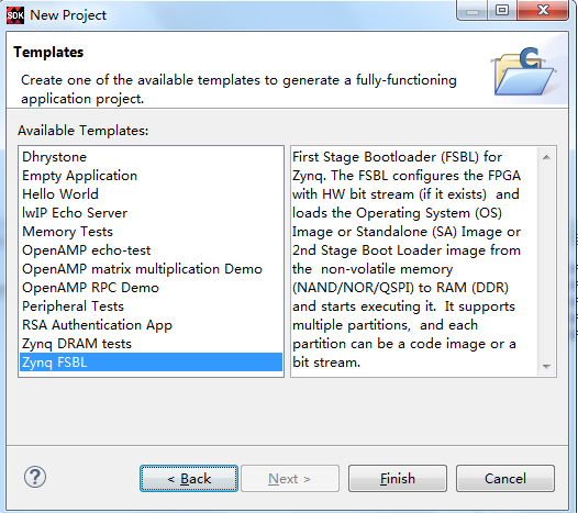 (3)选择 Zynq FSBL,然后点击 Finish。点击 Finish 之后会出现以 vx为名字的工程。