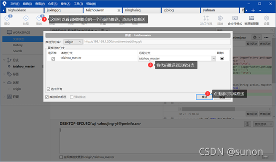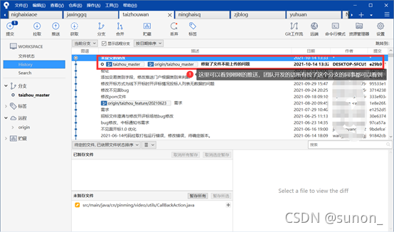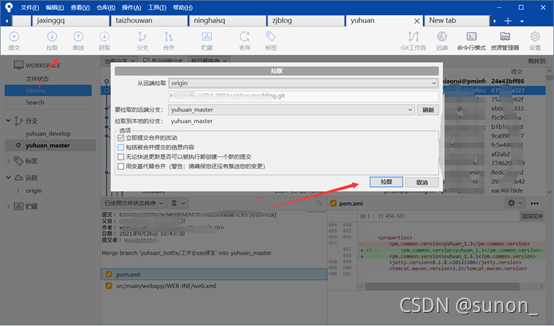 pull拉取远程代码到本地(将同事提交的代码先拉到本地,再开发,防止冲突),直接点击操作区的拉取按钮即可将代码拉取,如果有需要拉取的内容会显示数字。