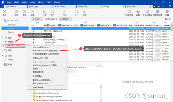将两个分支的代码合并,比如主分支事master,然后在test分支进行开发,开发完成后需要保持master事最新版本,所以需要将test分支合并到master。具体操作如下图: