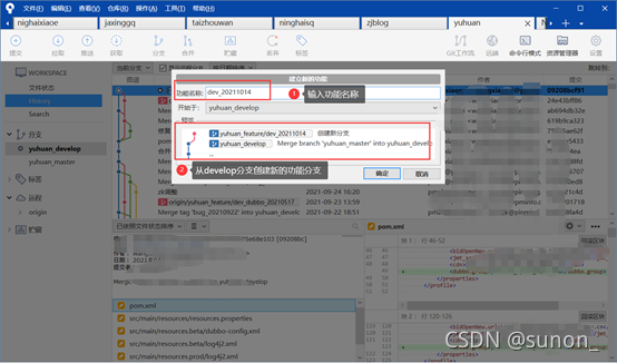 在预览中可看到,feature分支是从develop分出的,输入功能名称,点击确定,项目结构中增加feature分支,并且当前开发分支指向新建的feature分支