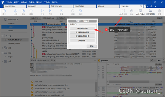 1) 新建feature。首先当前开发分支指向develop,点击“Git工作流”