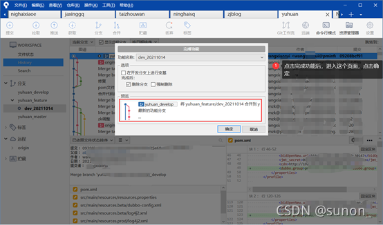 注意:当确定开发完成并且无误后再完成工程并删除分支,否则可以保留开发分支