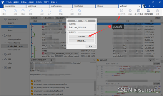 将当前分支指向dev_20211014分支,点击“Git工作流”,选择“完成功能”