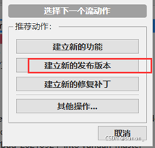 当开发到一定阶段,可以发布测试版本时,可以从develop分支,建立release分支,进入预发布测试阶段。点击“Git工作流”,选择“建立新的发布版本”