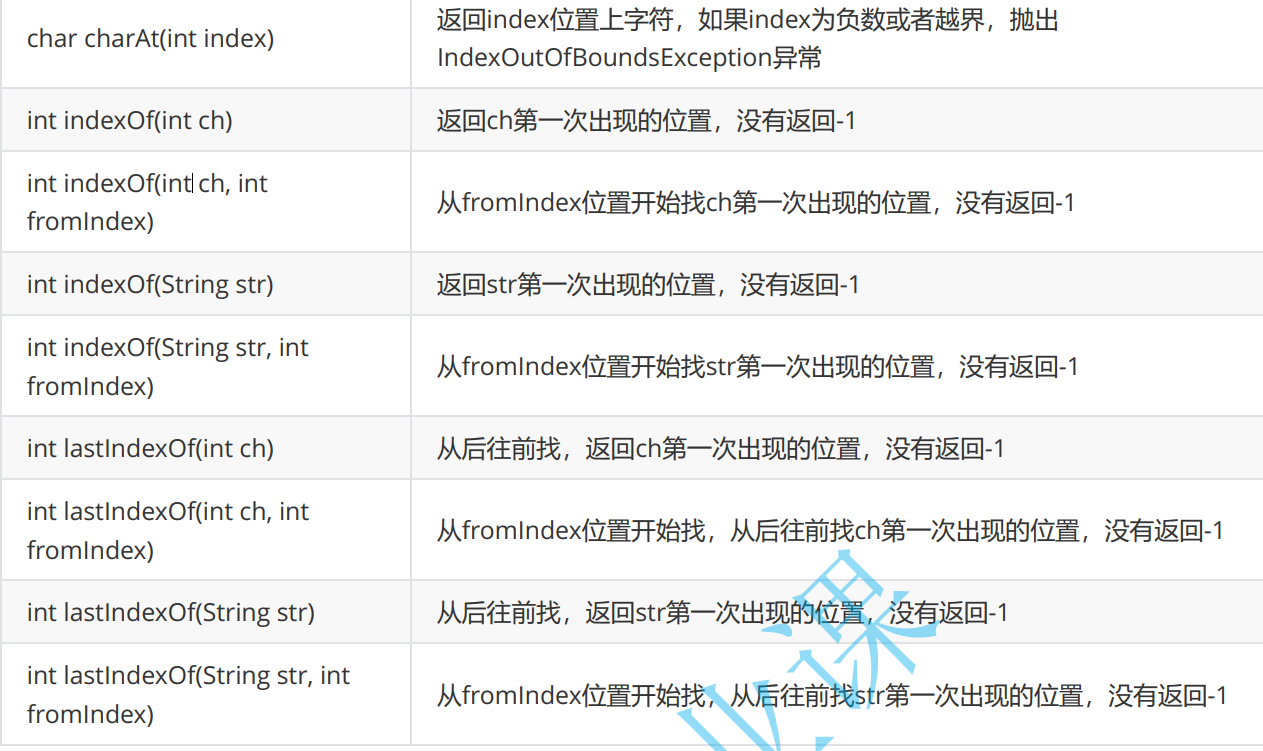 和返回下标的 indexOf 和lastIndexOf 又方法重载不同的一些输入实参。有查找某一个字符的ch 和从fromindex位置开始查的ch,和从后往前查的,还有查字符串的。