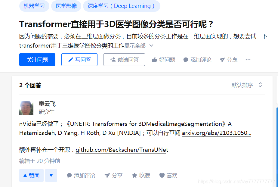 答:①UNETR: Transformers fori 3D Medcal Image Segmentation