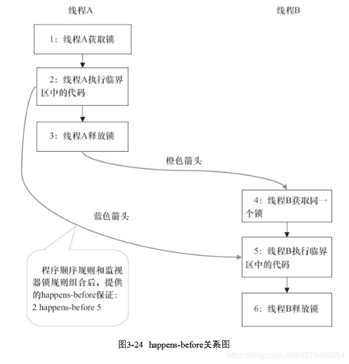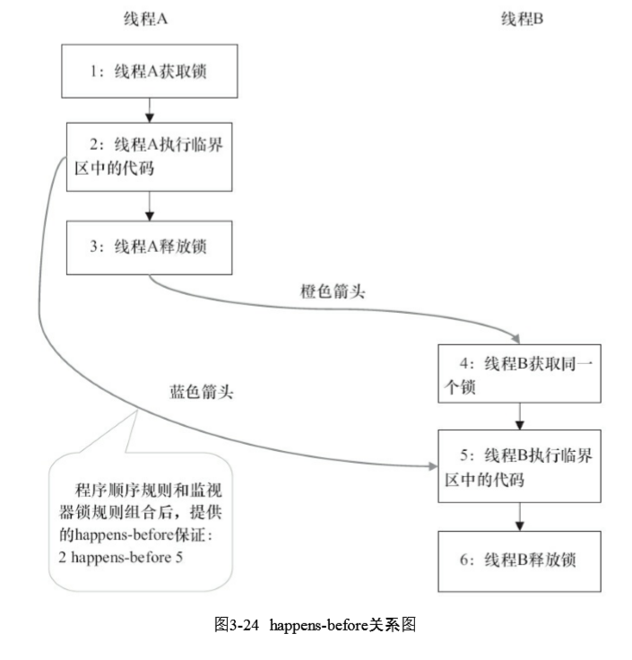 每一个箭头链接的两个节点,代表了一个happens-before关系。黑色箭头表示 程序顺序规则;橙色箭头表示监视器锁规则;蓝色箭头表示组合这些规则后提供的happensbefore保证。