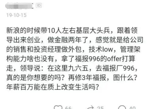 可提离职的时候领导竟然说:在我们这里965,去福报厂996,真的就是你想要的吗?在修3年福报,图什么?年薪百万能在质上改变生活吗?再说了你是我一手带出来的,为了年薪百万连兄弟都不做啦?男子听完领导的话惆怅。