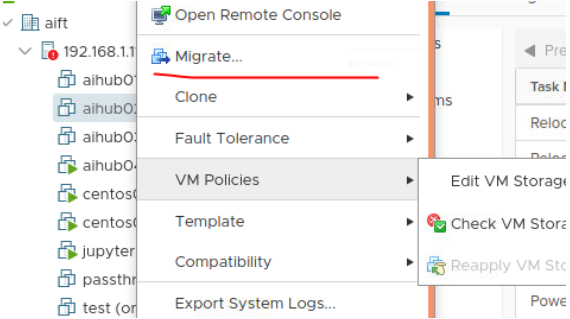 在vSphere控制界面中,选择相对应的虚拟机,选择migrate到选择的主机上,注意看提示信息