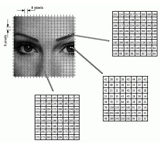 如下图所示。比如一个160x160大小的原始图像,就可以分成20x20个8x8图像块。
