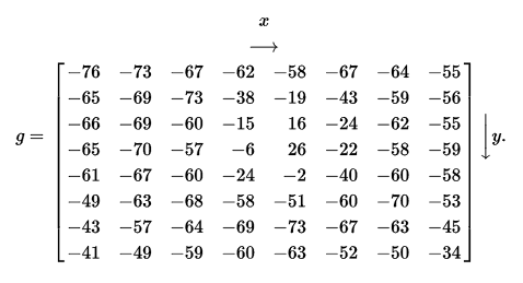 不要把上式看的有多难,也不要被“离散余弦变换”这个词给吓到,其实他没什么(如果你非要去追究,那就打开“信号与系统”的书复习一下吧,我拦不住你哈),上式其实就是一个运算公式而已。