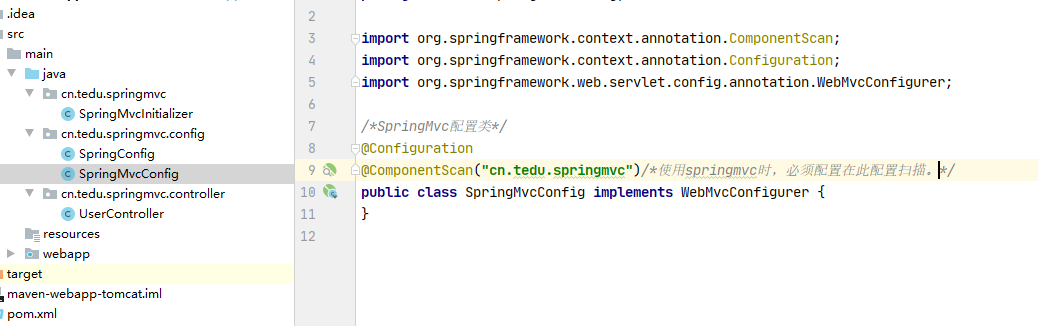 SpringMvcConfig)上添加@EnableWebMvc注解(增强模式),否则响应时将导致出现HTTP的406错误。/*SpringMvc配置类*/ @EnableWebMvc @Configuration @ComponentScan("cn.tedu.springmvc")/*使用springmvc时,必须配置在此配置扫描。*/ public class SpringMvcConfig implements WebMvcConfigurer { }