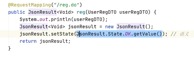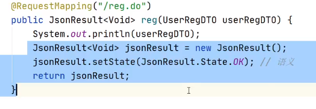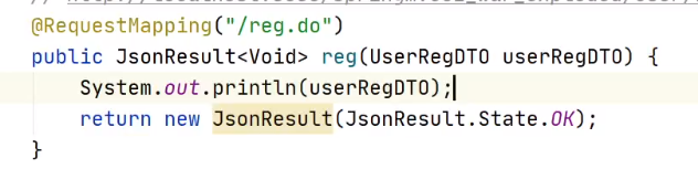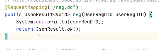 package cn.tedu.springmvc.dto; public class UserRegDTO { private String username; private String password; private Integer age; // 生成Setters & Getters // 生成toString() }// http://localhost:8080/springmvc01_war_exploded/user/reg.do?username=root&password=123456&age=25 @RequestMapping("/reg.do") public String reg(UserRegDTO userRegDTO) { System.out.println(userRegDTO); return "OK"; }再加属性时就不用更改方法的参数