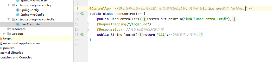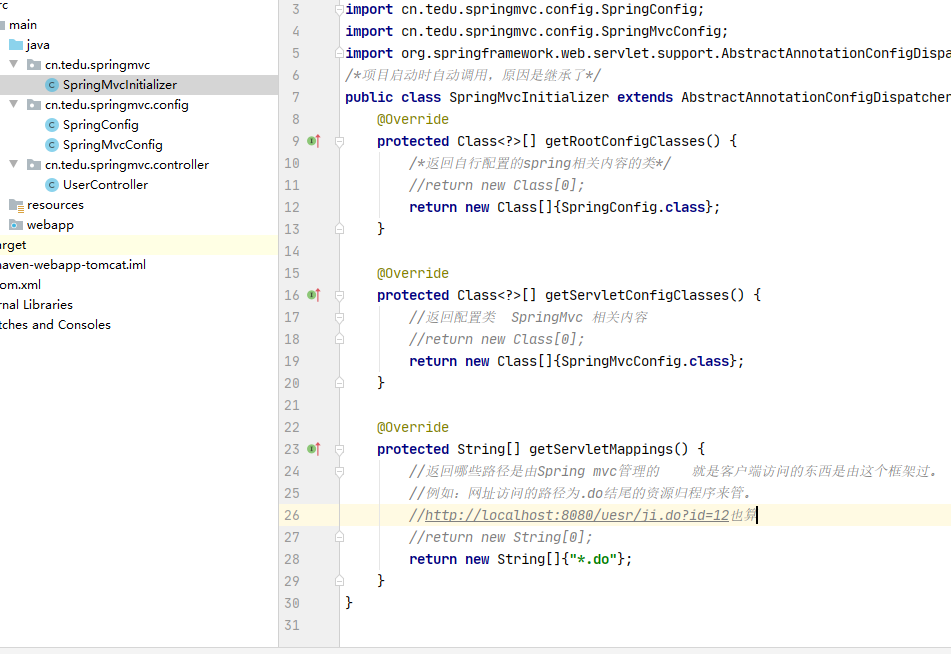 AbstractAnnotationConfigDispatcherServletInitializer的子类,即当前项目中自定义的SpringMvcInitialier,无论这个类放在哪个包中,都会自动创建并加载,由于会自动调用这个类中所有方法,所以会将Spring MVC框架处理的请求路径设置为*.do,并执行在UserController中配置的方法对cn.tedu.springmvc的组件扫描,进而会创建UserController的对象,由于使用了@RequestMapping("/login.do"),则此时还将此方法与/login.do进行了绑定,以至于后续随时访问/login.do时都会执行此方法- 注意:组件扫描必须配置在Spring MVC的配置类中