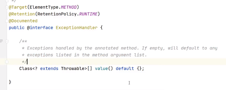 @ExceptionHandler注解,可用于表示被注解的方法是用于统一处理异常的,而且,可用于配置被注解的方法能够处理的异常的类型,其效力的优先级高于在方法的参数上指定异常类型。@ExceptionHandler注解源代码: 注释说明,如果没有标记是哪种异常,则使用方法参数的异常类型,标记了接受时使用注解的异常类型,数组表示可写多个异常的class类型。一个: