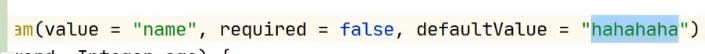 defaultValue属性:配置此请求参数的默认值,当客户端没有提交此请求参数时,视为此值 假设没有提交参数,上面默认一个值为HAHAHA(应用:当页面多个时,默认提交的值为1,就是展示第一页的值)