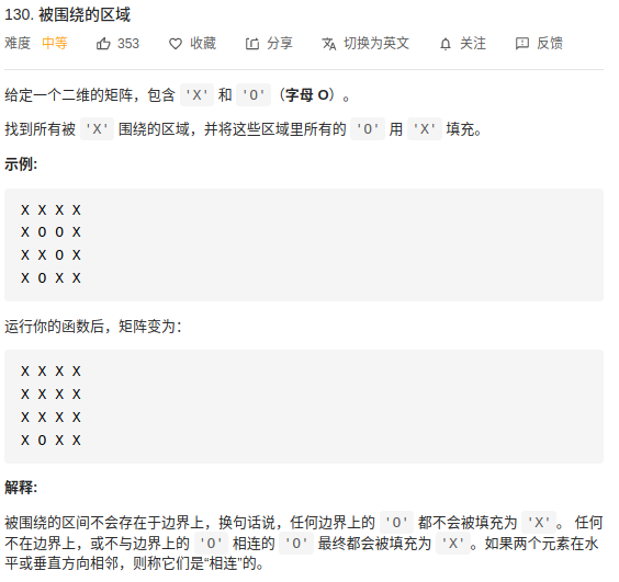 从边界开始搜,将与边界元素‘O’联通的‘O’置为‘#’,递归遍历完之后整个矩阵中只存在'X', 'O', '#'三种元素,此时矩阵中的'O'全部被'X'包围,然后将'O'全部改为'X', 将'#' 全部改为'O'。
